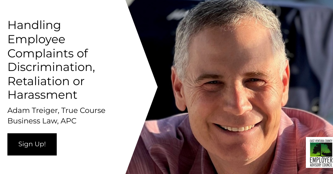 The East Ventura County Employer Advisory Council (EAC) is composed of employer volunteers representing a cross-section of businesses and industries. Its commitment is to assist employers in conducting their business more effectively and efficiently, to provide information on employment-related issues, and to enhance communication in the private sector. This presentation is provided for educational and informational purposes only; it does not constitute an endorsement of the curriculum or speakers by the East Ventura County EAC. We assume no responsibility for the accuracy, legality, or content of the materials provided during this event.
