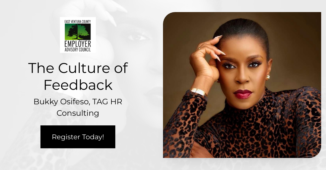 The East Ventura County Employer Advisory Council (EAC) is composed of employer volunteers representing a cross-section of businesses and industries. Its commitment is to assist employers in conducting their business more effectively and efficiently, to provide information on employment-related issues, and to enhance communication in the private sector. This presentation is provided for educational and informational purposes only; it does not constitute an endorsement of the curriculum or speakers by the East Ventura County EAC. We assume no responsibility for the accuracy, legality, or content of the materials provided during this event.